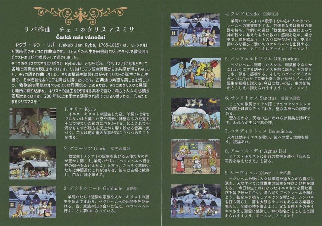 リバのクリスマスミサ曲はRybovkaともよばれ、ミサ曲の構成をとりつつ、ボヘミアを舞台にキリストの誕生を祝福する素朴で喜びに満ちた人々を描く牧歌的で陽気な雰囲気の曲です。毎年、クリスマスが近づくとチェコ各地の教会で演奏され、チェコの12月の風物詩となっています。